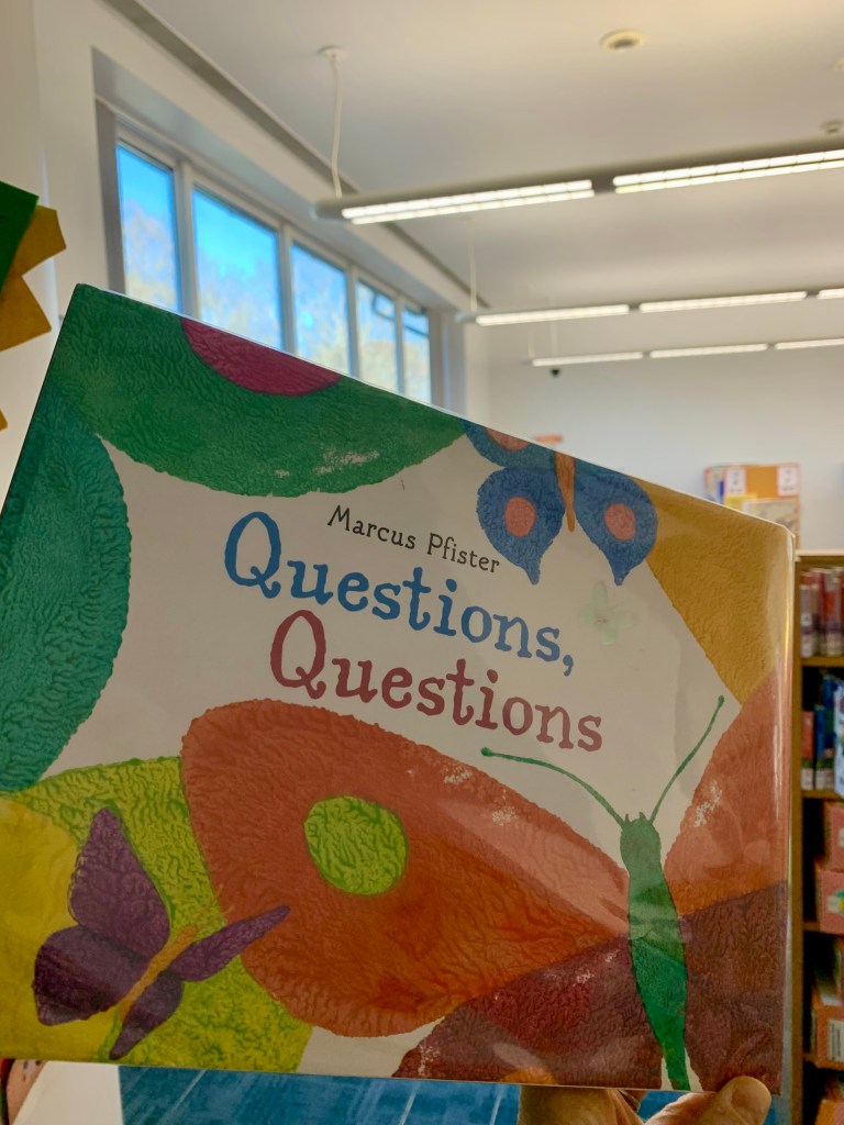 The book Questions, Questions by Marcus Pfister was our next read after everyone helped clean up the instruments and found their cushions again. I love the wonderment at God’s amazing design for the Earth that this book conveys without being overtly spiritual in its language.