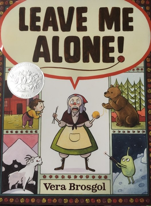 Brosgol uses patterned language, repetition, and predictability to tell her story.  For instance, the old woman’s actions to get ready to go on her journey to be alone are the same actions she takes as she prepares to leave the wormhole and head back to her family.  Also, each time the old woman finds a new place to knit, the text tells us where she walked to, what she did before sitting down to knit, what interrupts her, and her response of “Leave me alone!”  This increases the humor of the text, as her many attempts to find solitude are foiled and she must go to ridiculous lengths to find it.